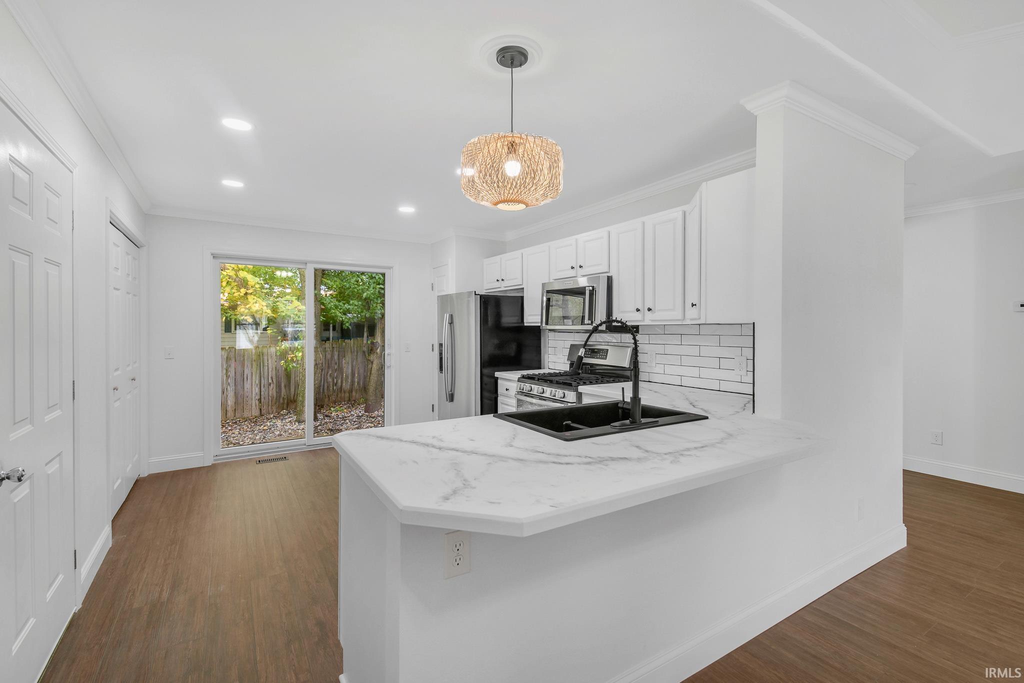 Newly remodeled 2 bedroom, 2 bath condominium conveniently located close to downtown Syracuse shops and restaurants. Within walking distance to public beach access to Syracuse Lake. New refrigerator, paint, flooring, trim, crown molding, lighting, and ceiling fans throughout. This condominium has freshly remodeled bathrooms and kitchen. New roof to be completed by end of February. May make a great rental property!