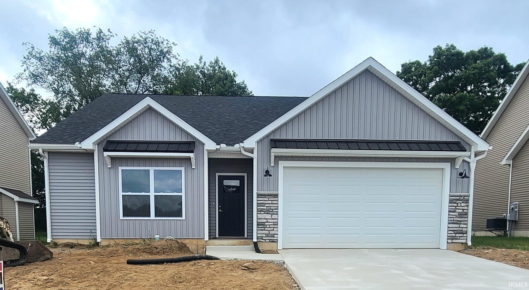 This charming open concept ranch is brand new and truly move-in ready! No updating required in this beautifully finished 3 bedroom, 2 bathroom home with attached two car garage. Cathedral ceilings in the great room and 9 foot ceilings throughout make this home open and spacious. The kitchen is equipped with solid surface countertops, white cabinetry with soft close doors and drawers, a walk-in pantry, and a large in-sink island with bar. This home comes with stainless steel appliances including: refrigerator, microwave, gas range/oven, and dishwasher. At the garage entry you'll find a mudroom area with built-in bench and additional storage. Off the mudroom is a large separate laundry room. A barndoor adds privacy to the pocket office located off the main hallway as well as character. In the main suite you'll find tray ceilings and large windows with plenty of natural light. The en suit features a double vanity, ceramic tile shower, and large walk-in closet. A hallway off the main entrance will take you to two bedrooms and a second full bath. All of the utilities can be found in an alcove in the garage so as not to take away from the garage bays.