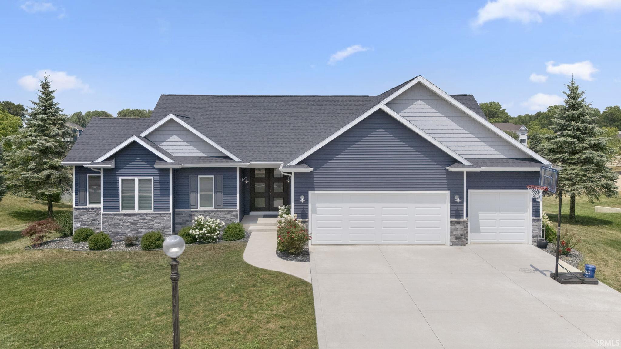 Open House on 7/20 from 1-3 pm. Stunning Custom Home in Shadow Lakes with Water Views Beautifully built by Bridgeport Homes, this 3 bed, 3.5 bath home features an open-concept layout, coffered ceilings, and a show-stopping fireplace in the great room. The gourmet kitchen includes upgraded stainless appliances and an oversized island, perfect for entertaining. The main-level owner's suite offers water views, porch access, His & Hers walk-in closets, and a spa-like bath with vaulted ceilings, tile shower, and garden tub. Walkout lower level includes 2 bedrooms, 2 baths, a large family room, wet bar, and home office with built in and a murphy bed—all overlooking a scenic pond.